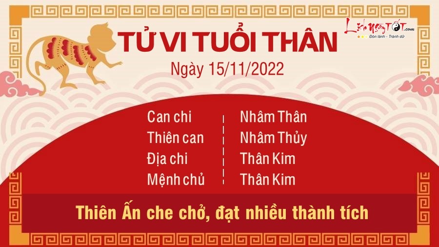 Nhờ Thiên Ấn tác động, người tuổi Thân có thể đạt được thành tích khả quan trong sự nghiệp. Những kết quả này đủ để giúp bạn được cấp trên công nhận. Đó cũng là nền tảng vững chắc giúp con giáp này được thăng chức hoặc tăng lương trong thời gian tới. Con đường công danh những ngày cuối năm của bạn rất thông thuận. Công việc suôn sẻ kéo theo tài chính cũng rất dư dả. Dù là khoản thu nhập chính hay phụ của Thân đều đổ về túi đều đặn. Dù vậy, bạn cũng không nên tiêu pha quá đà. Tiền bạc dù nhiều đến đâu cũng sẽ có lúc cạn kiệt, chính vì vậy bạn cần học cách tiết kiệm hơn. Ngày ngũ hành Kim vượng nên tình hình sức khỏe của Thân có chút sa sút. Bên cạnh vấn đề do thay đổi thời tiết, nguyên nhân phần lớn vì bạn quá tham công tiếc việc. Bạn nên cân bằng thời gian công việc và nghỉ ngơi, phải giữ cho bản thân khỏe mạnh thì mới có tinh thần tỉnh táo mà làm việc được.