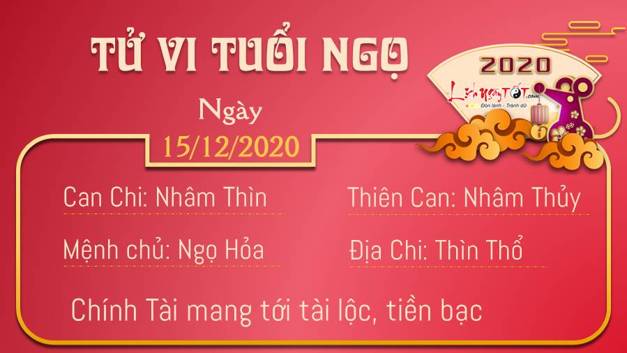 Chính Tài mang tới tài lộc, tin vui về tiền bạc cho tuổi Ngọ hoặc đơn giản là bạn bắt đầu có được những thói quen tốt về tiền. Một số người còn nhận ra mình đã tích lũy được một khoản tiền kha khá, biết hạn chế chi tiêu những món đồ không cần thiết. Hỏa - Thổ tương sinh hỗ trợ cho bản mệnh cải thiện mối quan hệ, tình cảm của bạn với đồng nghiệp cũng đang được cải thiện rõ rệt khi bạn biết lắng nghe nhiều hơn. Những ai muốn hợp tác làm ăn thì lúc này cũng có nhiều cơ hội hơn bao giờ hết. Ngày 15/12/2020 dương lịch là ngày Can Nhâm, không trị bệnh ở thận. Do đó, bản mệnh nên lưu ý việc này để tránh những hậu quả không đáng có.