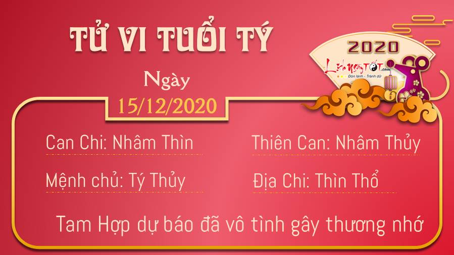 Tam Hợp dự báo tuổi Tý đã vô tình gây thương nhớ cho ai đó, có thể là người mà bạn không ngờ tới. Với người đang yêu nên có buổi hẹn hò thật lãng mạn, dễ thương bên nhau trong ngày này. Đó là cơ hội để tình yêu của hai người được thăng hoa. Thân thiện là tốt, nhưng thân thiện quá mức cần thiết chấp nhận cả những người xấu dưới sức ảnh hưởng của Kiếp Tài có thể đưa tuổi Tý vào một tình huống không mong muốn ngày hôm nay. Thủy - Thổ xung khắc khuyên bản mệnh cần lưu tâm hơn đến yếu tố sức khỏe ngày hôm nay. Bạn nên tới bác sĩ nếu cảm thấy bất cứ dấu hiệu bất thường nào, để được chăm sóc kịp thời.