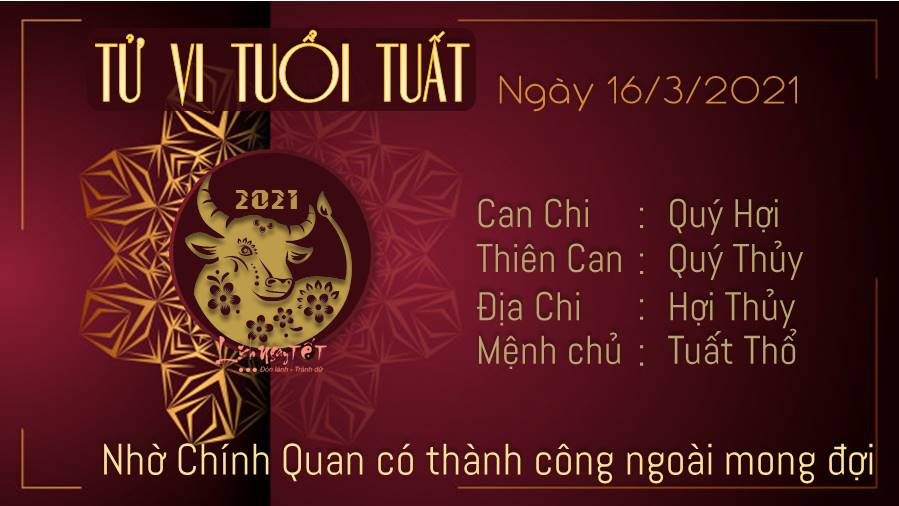Chính Quan cho biết thời cơ kết hợp với sự may mắn có thể đem lại cho tuổi Tuất sự thành công ngoài mong đợi, hãy kiên trì và chuẩn bị sẵn. Khi thời cơ đến, điều bạn mong muốn sẽ xuất hiện mà thôi, thế nên đừng chần chờ và thụ động nhé. Thủy - Thổ xung khắc khuyên bản mệnh tránh xa những thị phi, điều tiếng trong ngày hôm nay, từ rắc rối này có thể ảnh hưởng không nhỏ tới chuyện tình cảm của bạn và một nửa của mình. Hãy mặc kể những lời xì xào, nói xấu bạn hay về người ấy và tập trung vào nhiệm vụ của mình. Hôm nay bản mệnh nên ưu tiên xuất hành hướng Hỷ thần: Hướng Đông Nam, hoặc hướng Tài thần: Hướng Tây Bắc, hạn chế chọn hướng Hắc thần: Hướng Đông Nam.