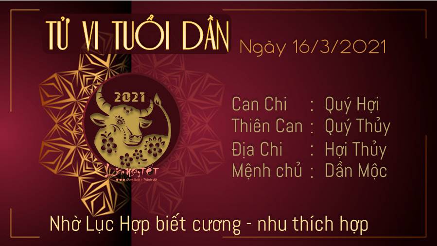 Tuổi Dần thường khó kiểm soát cảm xúc của mình nhưng hôm nay nhờ Lục Hợp mà bạn biết cương - nhu thích hợp. Nhờ đó có người trước đây không ưa nhưng vẫn thể hiện sự tôn trọng với bạn. Ảnh hưởng của Thương Quan nên con giáp tuổi Dần tự trách rằng mình kém cỏi, yếu đuối. Nếu cảm thấy mình rơi vào một tình huống đầy khó khăn nào đó, hãy tìm tới bạn bè. Người bạn mà bạn có thể tin tưởng sẽ giúp đỡ bạn vượt qua khoảng thời gian này bằng những lời khuyên giá trị và thấu đáo nhất. Ngũ hành tương sinh mang đến tin vui tình cảm cho bản mệnh, nếu đang thầm thương trộm nhớ ai đó thì bạn có thể ngỏ lời lúc này vì cơ hội thành đôi rất cao.