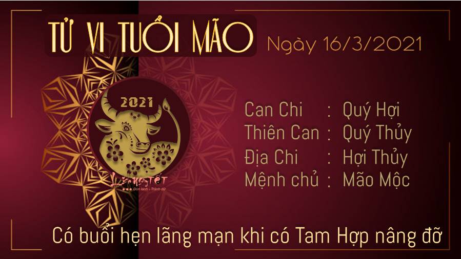 Tuổi Mão độc thân hôm nay có buổi hẹn vô cùng lãng mạn khi có Tam Hợp nâng đỡ. Hãy thử cùng nhau tới một nhà hàng mới lạ để cả hai có những trải nghiệm mới bạn nhé. Một số cặp đôi nhân cơ hội này có thể cùng kế hoạch cho tương lai. Khi có nhiều điều kiện hậu thuẫn nhờ Thực Thần soi chiếu thì nhịp bước đều đặn và ổn định thực sự sẽ có tác dụng lớn trong đời sống của tuổi Mão ngày hôm nay. Thế nên, thay vì vội vã bắt nhịp với những thay đổi, xáo trộn, tốt nhất bạn nên cho mình được cơ hội tận hưởng sự thoải mái này thì hơn. Thủy - Mộc tương sinh cho thấy có tín hiệu tốt cho bản mệnh về khía cạnh tiền bạc, thậm chí có người còn nhiệt tình hỗ trợ khi bạn gặp khó khăn.