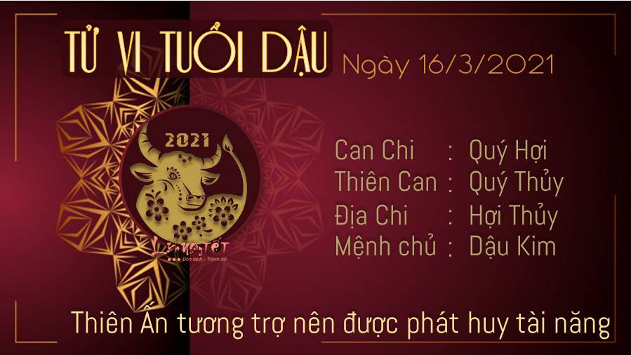 Thiên Ấn tương trợ nên tuổi Dậu được phát huy tài năng của mình. Với cặp mắt quan sát tinh tường, chắc chắn bạn sẽ phát hiện ra nhiều chi tiết quan trọng cho một vấn đề nào đó ngày hôm nay, kể cả khi những người xung quanh bạn không nhận ra điều đó. Vì thế, hãy bình tĩnh và chậm rãi để có thể nhìn thấu suốt tất cả. Thủy - Kim tương sinh mang lại duyên lành cho bản mệnh từ trong làm ăn cho tới chuyện tình cảm. Người độc thân có nhân duyên rất tốt với người khác giới, dễ gặp người phù hợp với mình thông qua lời giới thiệu của người quen. Thai thần ở hướng Đông Nam phía ngoài cửa phòng thai phụ và phòng giã gạo, không nên dịch chuyển ở nơi này tránh làm động Thai thần.