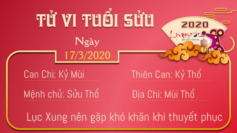 Lục Xung cho thấy con giáp tuổi Sửu dường như gặp khó khăn trong việc thuyết phục một ai đó ngày hôm nay. Khả năng chinh phục của bạn dường như không ở mức cao như thông lệ, và vì thế đối phương chưa thực sự bị ấn tượng bởi bạn như bạn nghĩ. Trong ngày có Tỷ Kiên, nếu con giáp tuổi Sửu muốn xóa bỏ những căng thẳng, bực dọc với ai đó ngày hôm nay, cách tốt nhất là trò chuyện thẳng thắn, mặt đối mặt. Việc bạn trốn tránh cách giải quyết này chỉ làm mọi thứ sẽ càng căng thẳng, tồi tệ hơn mà thôi. Thổ khí vượng không hề tốt cho sức khỏe của bản mệnh, do đó ngày hôm nay chớ nên nóng giận, bực tức kẻo ảnh hưởng tới sức khỏe hiện tại.