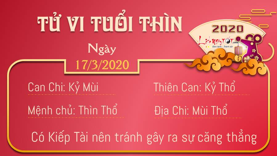 Con giáp tuổi Thìn cần phải tránh đặt bản thân vào những tình huống có thể gây ra sự căng thẳng về mặt cảm xúc ngày hôm nay dưới tác động của Kiếp Tài. Tốt nhất là bạn nên tự tháo gỡ mình khỏi những rắc rối không mong muốn bằng cách tập trung vào công việc cá nhân thì hơn. Thổ khí vượng tác động không tốt tới sức khỏe của bản mệnh, thời gian này bản mệnh nên nghỉ ngơi, bạn đã đủ mệt mỏi, căng thẳng rồi và đây là lúc bạn dành chút thời gian cho bản thân, đừng cố lao đầu ra ngoài kia mà tranh đấu hơn thua. Trong ngày này, vị trí của Thai thần ở hướng chính Đông phía ngoài cửa phòng thai phụ và nhà vệ sinh, không nên dịch chuyển vị trí đồ đạc, sửa chữa đục đẽo ở nơi này.