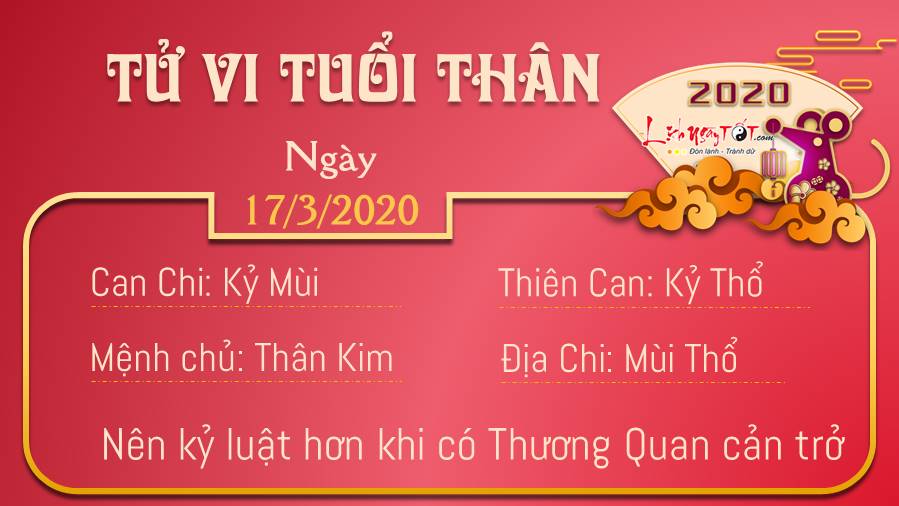 Kỷ luật cá nhân cần được nâng cao ngày hôm nay, nhất là khi có Thương Quan cản trở đấy con giáp tuổi Thân nhé. Dường như mọi cám dỗ có thể xuất hiện khắp nơi, khiến cho bạn gặp khó khăn trong việc tự điều chỉnh cảm xúc của bản thân. Kết quả của công việc hoàn toàn phụ thuộc và nỗ lực của bạn mà thôi. Ngũ hành tương sinh là cơ hội tốt để sửa chữa mối quan hệ hiện tại, nhất là các cặp đôi đang trong giai đoạn căng thẳng, giận dỗi nhau. Người độc thân cũng nên mở lòng mình ra vì đây là lúc bạn tìm được người ưng ý đấy. Hôm nay nếu đi đâu, bản mệnh nên ưu tiên hướng Hỷ thần: Hướng Đông Bắc hoặc hướng Tài thần: Hướng Nam, chớ nên chọn hướng Hắc thần: Hướng Đông.