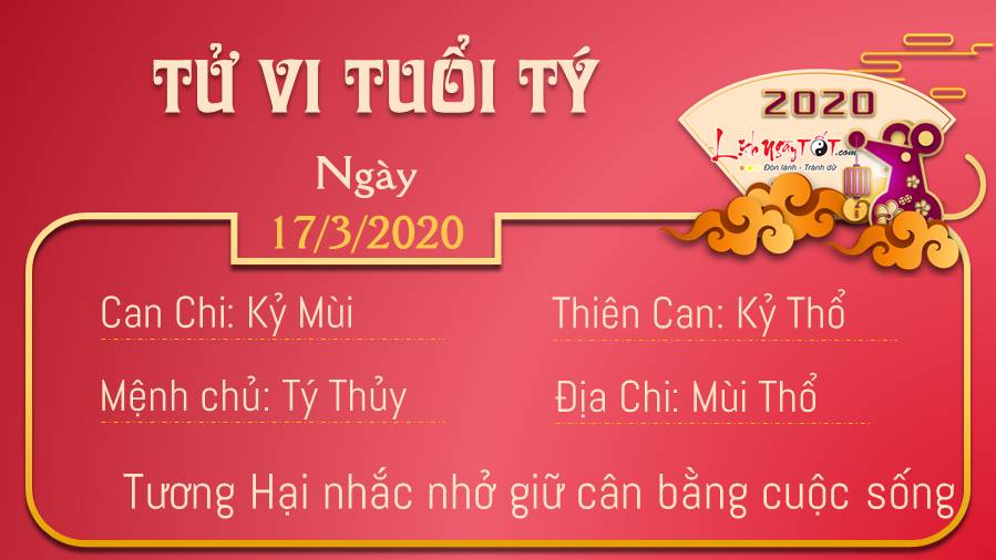 Tý Mùi Tương Hại, bản mệnh đừng đặt mục tiêu sự nghiệp lên trên đời sống cá nhân, bởi vì sự mất cân bằng có thể xảy ra trong cuộc sống của bạn. Tốt nhất là hãy cố gắng để cân bằng cán cân này, nhờ thế mỗi phút đi qua mới thực sự thoải mái. Thiên Tài đã giúp sức để con giáp tuổi Tý vào một vị trí đầy sức mạnh trong đời sống của một người nào đó, cho bạn thể hiện những cảm xúc, suy nghĩ của mình với đối phương. Nếu bạn còn bất cứ điều gì trong lòng thì hôm nay thực sự là một cơ hội tốt để bạn chia sẻ với người ấy đấy, đừng bỏ lỡ. Ngũ hành xung khắc cho thấy khi bạn thể hiện cái tôi quá lớn sẽ khiến cho mọi người có cảm giác xa cách khiến mối quan hệ của bạn với người thân bị rạn vỡ.