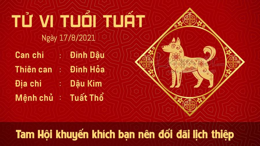 Tam Hội khuyến khích con giáp tuổi Tuất đối đãi lịch thiệp với mọi người xung quanh mình trong ngày hôm nay. Một nụ cười, một cái nháy mắt cũng đem đến nhiều điều đáng yêu cho tâm hồn của bạn đấy. Tham vọng mà thiếu đi lý trí sẽ che khuất chân trời của con giáp tuổi Tuất, nhất là ảnh hưởng của Thương Quan nên bạn dễ đi sai hướng. Hãy lùi lại một bước để nhìn nhận rõ mọi việc, và rồi trời sẽ lại quang, mây tạnh mà thôi. Kim - Thổ tương sinh giúp cho bản mệnh đã bình tâm sau những khó khăn, bạn đã chủ động hơn trong việc điều chỉnh thái độ với những gì đang xảy ra với mình. Lúc này bạn không còn mất ngủ như trước và thường xuyên có được giấc ngủ sâu.