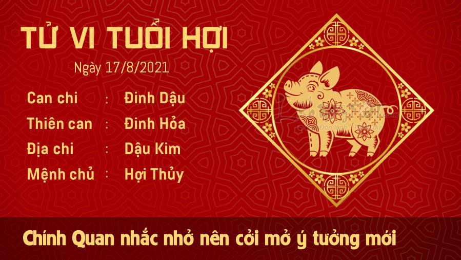 Chính Quan nhắc nhở con giáp tuổi Hợi điều quan trọng nhất trong ngày hôm nay là hãy cởi mở với những ý tưởng mới, với những mục tiêu mới, nhờ thế bạn sẽ thấy từng phút giây đi qua rất ý nghĩa và giá trị đấy. Kim - Thủy tương sinh hậu thuẫn cho vận trình tình cảm của bản mệnh được suôn sẻ, nhiều cặp vợ chồng dần tìm cách để hòa hợp và yêu thương nhau nhiều hơn. Một số khác biệt không làm cho hai người cảm thấy căng thẳng như trước đây. Theo Nhị thập bát tú khuyên bản mệnh khởi công tạo tác việc gì cũng không tốt. Kỵ nhất là chôn cất, sửa đắp mồ mả, đóng thọ đường.