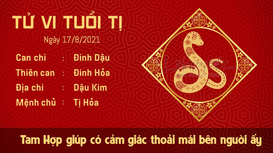 Tam Hợp dự báo hôm nay người ấy tạo cho con giáp tuổi Tị cảm giác thoải mái để bạn có thể chủ động đưa ra quan điểm cá nhân chứ không còn im lặng và chịu đựng. Sự việc sẽ được giải quyết một cách dễ dàng và giúp hai người xích lại gần nhau hơn khi cùng đồng thuận và hiểu vấn đề đang diễn ra. Ảnh hưởng của Kiếp Tài nên con giáp tuổi Tị cảm thấy nghi ngờ người xung quanh cho tới nghi ngờ chính khả năng của mình trong ngày này. Hôm nay không hề phù hợp cho các quyết định vì có thể thấy lý trí của bạn không thực sự sáng suốt đâu nhé. Ngũ hành xung khắc nhắc nhở bản mệnh cẩn trọng hơn với khoản tiền mình đang có, hôm nay bạn có xu hướng quyết định sai lầm.