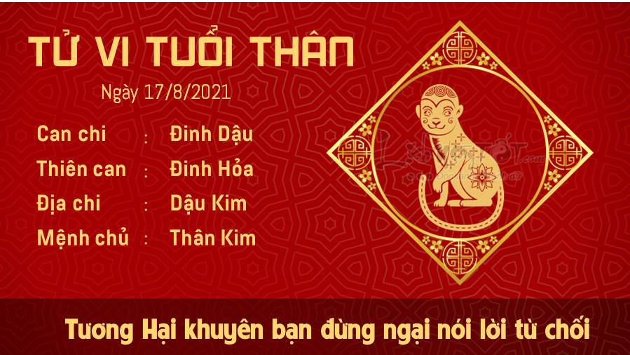 Người tuổi Thân đừng ngại nói lời từ chối, bởi vì những thứ quá mạo hiểm có thể khiến bạn phải trả giá đắt trong ngày hôm nay. Vấn đề không nằm ở bạn mà nằm ở ngoại cảnh và một số người bạn quá tin tưởng lại thực ra không đáng tin. Chính Tài đưa đến những chỉ dẫn để giúp con giáp tuổi Thân cải thiện tình hình tài chính hiện tại của mình. Trong khi người khác có vẻ chững lại thì bạn đã tìm ra cách để có thời gian tập trung thay đổi lối sống, tiết kiệm được nhiều tiền bạc hơn. Sức khỏe là vấn đề mà bản mệnh không được lơ là trong thời gian này đấy nhé, cho dù bạn đã có biện pháp phòng ngừa nhưng cũng đừng lơ là vì chỉ cần sai một ly là đi một dặm.