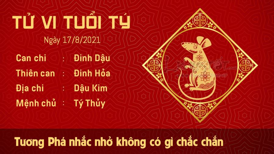 Tý Dậu Tương Phá nhắc nhở tuổi Tý cần thận trọng hơn vì không có gì chắc chắn trong ngày này cả. Mọi thứ mới mẻ đều không được chào đón ngày hôm nay. Hãy tập trung vào những giá trị quen thuộc và hoàn thành tốt những công việc bạn được giao phó thì hơn. Ảnh hưởng của Thiên Quan cho thấy tuổi Tý đang tự làm mình bị thương. Dường như bạn đang bám víu quá chặt vào một điều gì đó ngày hôm nay. Hãy học cách buông tay và để cho mọi việc diễn ra như nó vốn có, nếu bạn muốn tìm kiếm sự bình yên cho tâm hồn. Ngũ hành tương sinh hỗ trợ cho bản mệnh cải thiện được tình hình sức khỏe hiện tại, nhờ đó mà bạn đủ tinh thần để đối mặt với những khó khăn xảy ra.