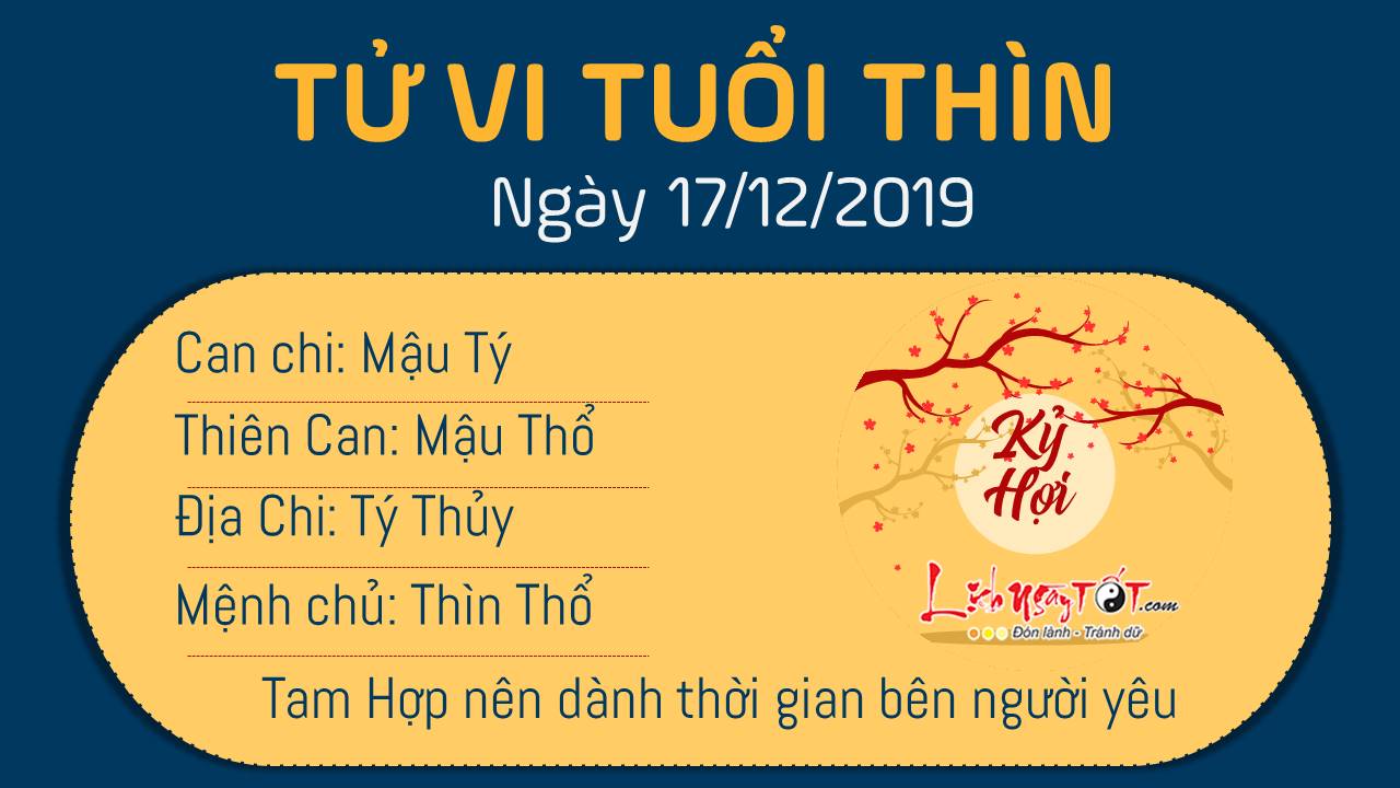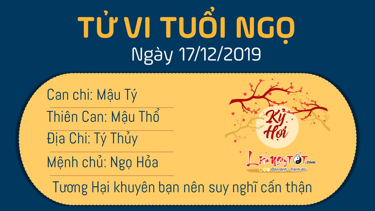 Nhờ sự hỗ trợ của Thiên Ấn nên hôm nay người tuổi Tị có ưu thế là khả năng thuyết phục mọi người, điều đó giúp bạn chiếm ưu thế trong mọi cuộc trao đổi, thương thuyết. Thời điểm này khá phù hợp cho việc hợp tác và ký kết hợp đồng, bạn nên thực hiện những việc này trong ngày hôm nay. Thủy - Hỏa tương xung dự báo có sự xung đột trong mối quan hệ với người thân yêu. Có thể vì không hiểu ý nhau nhưng bạn lại đang cố bảo vệ quan điểm của mình nên mới xảy ra căng thẳng này, bạn nên tìm cách điều hòa tâm trạng của chính bản thân mình đi nhé. Ngày 17/12/2019 dương lịch là ngày Can Mậu, không trị bệnh ở bụng.