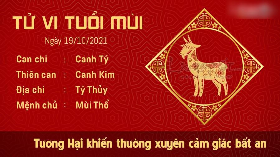 Tý Mùi Tương Hại khiến người tuổi Mùi hôm nay thường xuyên có cảm giác bất an, thiếu quyết đoán. Tuy nhiên, bạn có thể khắc phục điều đó bằng việc tìm đến những người tích cực. Nên tìm người đáng tin cậy để có đủ những gợi ý, lời khuyên thích hợp. Chính Ấn tương trợ cho người tuổi Mùi làm công việc có tính chuyên môn phát huy được nội lực. Những người làm việc nghiên cứu có cơ hội thành công cao, được đánh giá tích cực và ghi nhận từ cấp trên. Thủy - Thổ xung khắc khiến nhiều người rơi vào tình trạng nợ nần cũng chỉ vì bạn không có tiền dự trữ trong khi khó khăn. Rắc rối hiện tại khiến tâm trí bạn không còn sáng suốt, hãy xin lời khuyên và hỗ trợ của người thân bạn nhé.