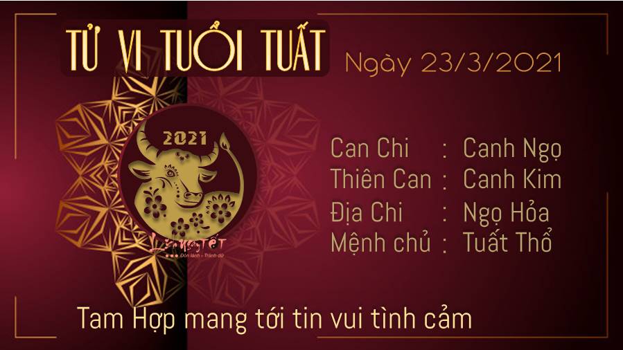 Tam Hợp mang tới tin vui về chuyện tình cảm cho tuổi Tuất, nhất là những cặp đôi dễ có tin vui bầu bí. Quý nhân sẽ mang đến cho bản mệnh đang độc thân nhiều cơ hội để gặp gỡ với người mình tâm đầu ý hợp. Thiên Ấn chắp cánh cho những ý tưởng của tuổi Tuất. Bạn đã sẵn sàng cho những bước đi mới của đời sống hay chưa vì đây là ngày để bạn tự tin dấn bước, khẳng định bản thân trước những đối thủ của mình. Điều quan trọng là đừng bỏ lỡ cơ hội của chính bạn nhé. Hỏa - Thổ tương sinh là tín hiệu tốt và khá lạc quan cho tình hình tài chính đang có dấu hiệu sa sút của bạn trong thời gian gần đây. Lúc này tập trung để cố gắng hòa vốn là tốt rồi, bạn đừng tham lam quá lại mất nhiều hơn đấy.