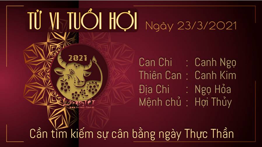 Người tuổi Hợi cần tìm kiếm sự cân bằng đặc biệt quan trong ngày Thực Thần ghé thăm. Bạn cần phải tìm kiếm điểm trung lập giữa một bên là sự hào phóng, rộng lượng và một bên là tính kiềm chế. Đừng cho đi tất cả những gì mà bạn có rồi hối tiếc. Hỏa - Thủy xung khắc dự báo có thể vợ chồng tranh cãi vì một chủ đề không liên quan. Thay vì đôi co hai người hãy học cách biết vun vén tình yêu, hạnh phúc gia đình đôi bên. Ngày tốt theo Nhị thập bát tú, hôm nay bản mệnh nên làm: Khởi công trăm việc đều tốt. Tốt nhất là xây cất nhà cửa, cưới gả, chôn cất, trổ cửa, tháo nước, các việc thủy lợi, đi thuyền.