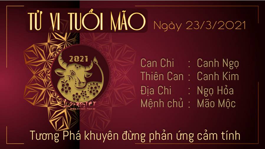 Mão Ngọ Tương Phá khuyên con giáp tuổi Mão đừng phản ứng một cách quá cảm tính về vấn đề của một người nào đó ngày hôm nay, bởi vì chúng sẽ gây tác động đến những cảm xúc thực của bạn lẫn công việc của chính bạn đấy. Chính Tài ghé thăm mang tới may mắn cho con giáp tuổi Mão, hôm nay đường tài lộc có nhiều dấu hiệu khởi sắc rõ rệt. Thậm chí có những người mang cho bạn cơ hội kiếm tiền, gia tăng thu nhập. Hỏa - Mộc tương sinh hậu thuẫn cho chuyện tình cảm của bản mệnh. Nếu bạn đang có ý định tiến xa hơn trong mối quan hệ hiện tại thì có khá nhiều điều kiện thuận lợi, hậu thuẫn cho bạn rất nhiều đấy.