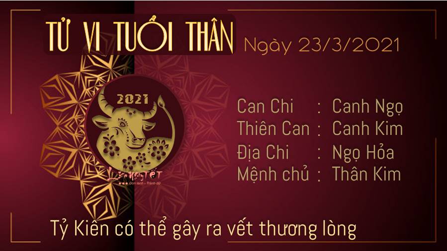 Tỷ Kiên có thể gây ra vết thương lòng cho tuổi Thân nên ngày hôm nay trở nên thu mình lại, bạn có xu hướng nội tâm, tĩnh lặng hơn lệ thường. Thế nên hãy làm mọi công việc một cách chậm rãi hơn, đừng cố khiên cưỡng chống lại những cảm xúc của chính bạn. Hỏa - Kim xung khắc khuyên bản mệnh nên cẩn trọng, đừng vì chủ quan mà phạm lỗi. Nhất là những lỗi tệ hại khi mà công việc của bản mệnh xuất hiện những sai sót khá lớn vì sự thiếu tập trung của bản mệnh. Thai thần ở hướng chính Nam phía ngoài của phòng giã gạo, phòng xay bột, thai phụ không nên lui tới tránh làm động Thai thần, ảnh hưởng đến cả người mẹ và thai nhi.