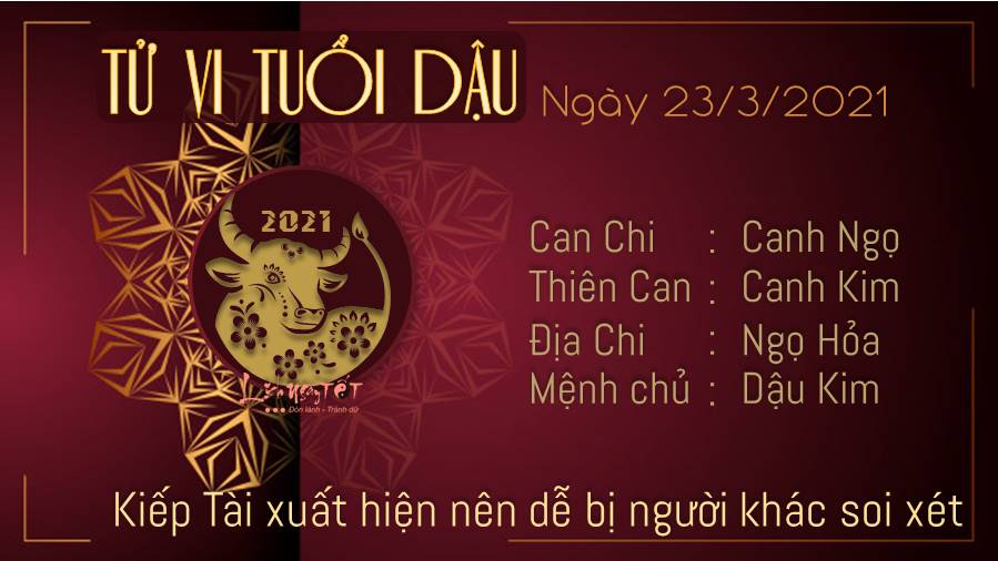 Kiếp Tài xuất hiện nên mọi người hay soi xét tuổi Dậu hơn bao giờ hết. Mọi người đang ngầm quan sát bạn, ghi chú lại những điều mà bạn nói, lưu tâm những hành động mà bạn làm. Thế nên nên thận trọng trong lời ăn tiếng nói, cách hành xử ngày hôm nay nhé, nếu không bạn có thể hối tiếc đấy. Ngũ hành xung khắc khiến sức khỏe và thể lực của bạn giảm sút, lúc này bản mệnh cần phải chú ý giữ gìn sức khỏe. Công việc quan trọng nhưng sức khỏe còn quan trọng hơn, bạn nên dành nhiều thời gian hơn cho việc nghỉ ngơi nhé. Ngày 23/3/2021 là ngày Ngày Dương công kỵ, do đó bản mệnh nên tránh những việc quan trọng, ngày này xấu cho mọi việc nhưng đặc biệt xấu với việc xây dựng.