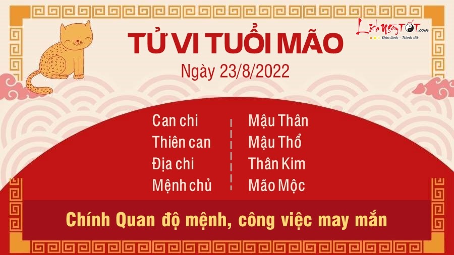 Chính Quan tương trợ, người tuổi Mão có thể gặp nhiều may mắn trong vận trình sự nghiệp của mình. Các dự án bạn đang theo đuổi đều có tiến triển vô cùng suôn sẻ. Chỉ cần bản mệnh tiến hành đúng theo kế hoạch đã đề ra thì mọi việc đâu vào đó, kết quả nhận được rất đáng mong đợi. Công việc thuận lợi cũng kéo theo thu nhập được đảm bảo. Bạn có thể hoàn toàn yên tâm làm tốt công việc của mình thì đời sống vật chất không có gì phải lo lắng. Những người làm buôn bán kinh doanh cũng có lợi nhuận rủng rỉnh, buôn may bán đắt nhờ sự tháo vát của mình. Tuy nhiên, con giáp này có thể gặp phải chuyện buồn phiền trong tình cảm do ảnh hưởng của ngũ hành tương xung. Mặc dù nhân duyên không tệ nhưng do bản mệnh kiểm soát cảm xúc chưa tốt nên cuộc tình đang tiến triển tốt đẹp bỗng chốc đứt quãng, gây tiếc nuối vô cùng.