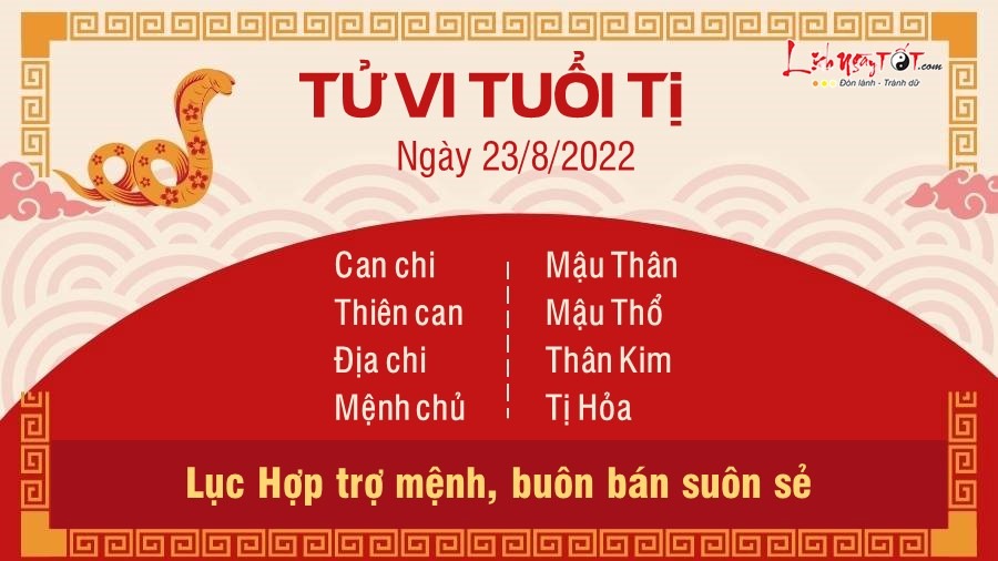Tuổi Tị có thể đón nhiều niềm vui về tiền bạc nhờ Lục Hợp che chở. Việc buôn bán kinh doanh như được tiếp thêm nguồn sinh khí mới khi bạn đã nắm bắt được biến động thị trường để kịp thời điều chỉnh. Bạn đang có lợi thế dẫn đầu so với đối thủ đấy, nên tận dụng cơ hội này. Chẳng những vậy, Thiên Ấn cũng giúp công danh sự nghiệp của con giáp này rộng mở hơn. Nhờ chính sự thông minh, khoan dung của bạn đã trở thành lợi thế chiếm được cảm tình của đồng nghiệp cũng như cấp trên, đạt được bước tiến mới quan trọng trong công việc của mình. Hỏa – Kim xung khắc nhắc nhở Tị nên nghiêm túc xem xét lại các mối quan hệ của mình. Bạn cần xác định mình đang tìm kiếm điều gì, những vấn đề trong các mối quan hệ trong quá khứ ảnh hưởng như thế nào tới bạn và liệu bạn đã sẵn sàng cho một mối quan hệ mới hay chưa.