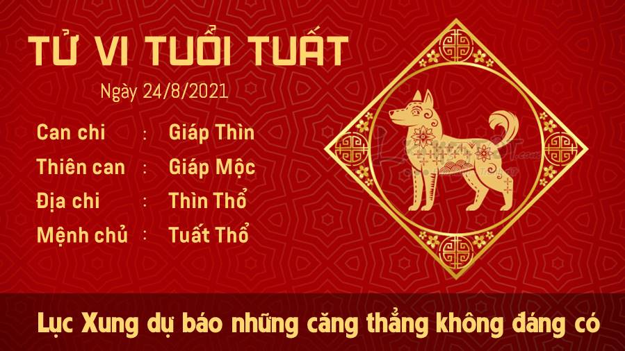Lục Xung dự báo những căng thẳng không đáng có mà tuổi Tuất phải đối mặt trong hôm nay. Nếu bạn cảm thấy mình đang thu hút những nhân vật không phù hợp, tốt nhất là hãy ngừng tương tác lại đã. Đừng kéo ai đó vào những mối quan hệ mà bạn hoàn toàn không hứng thú. Thiên Tài cho thấy sau những nỗ lực, cố gắng hết mình thì ngày hôm nay, người tuổi Tuất đã đạt được những thành quả đáng giá, không chỉ về mặt tài chính. Để đảm bảo sức khỏe thì cố gắng đi ngủ sớm, ăn uống đầy đủ, nhớ ăn hoa quả để có sức đề kháng bạn nhé. Không có gì quan trọng bằng sức khỏe lúc này đâu, do đó nhất định không được chủ quan đâu nhé.