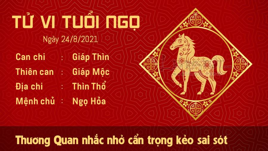 Thương Quan nhắc nhở con giáp tuổi Ngọ cẩn trọng kẻo sai sót. Lý lẽ mà ai đó đưa ra có thể khá lạnh lùng, khó chịu, nhưng rõ ràng họ đã đúng. Hãy lắng nghe lời khuyên của họ và có sự cân nhắc nhất định, thay vì để "gió thoảng qua tai". Ngũ hành tương sinh gây ảnh hưởng không nhỏ về mặt xu hướng, quan điểm thẩm mỹ, và điều đó khiến bạn được chú ý, quan tâm nhiều hơn. Bạn hoàn toàn có thể tự tin và những thể hiện của mình ở hiện tại đấy. Ngày 24/8/2021 dương lịch là ngày Can Giáp, không trị bệnh ở đầu. Do đó, bản mệnh lưu ý không nên tác động lên vị trí này trong ngày hôm nay.