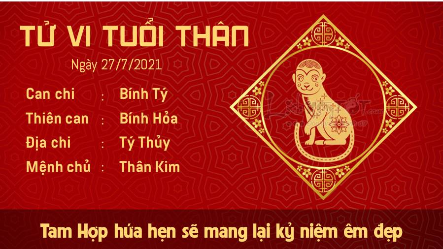 Tam Hợp hứa hẹn sẽ mang lại cho tuổi Thân những kỷ niệm êm đẹp trong ngày hôm nay. Ví dụ như nếu đang phải làm việc ở nhà cũng là cơ hội để bạn và người ấy cùng nhau thưởng thức bữa sáng mỗi ngày. Thiên Tài giúp cho con giáp tuổi Thân cải thiện tài chính trong ngày hôm nay. Bạn có quyền chiều chuộng bản thân mình một chút ngày nhưng đừng thái quá đến mức không cần thiết và làm hư chính bạn nhé. Mọi thứ đều cần có ranh giới quy tắc. Bạn đang ở vị thế và điều kiện rất tốt, do đó nên dành thời gian để tận dụng các cơ hội của mình. Ngoài ra, nếu có thời gian, bạn nên đi làm từ thiện, làm điều tốt cho mọi người, cho xã hội bạn nhé.