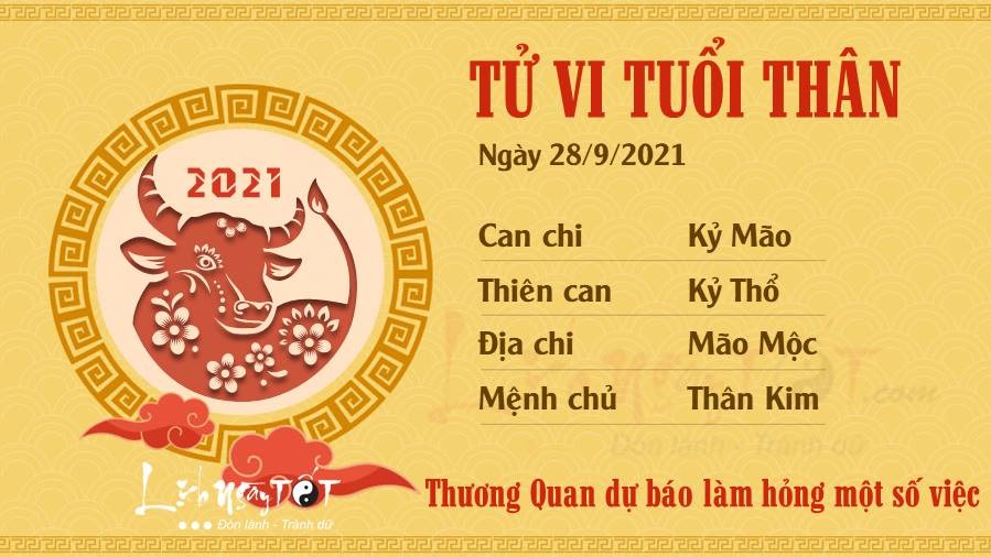 Thương Quan dự báo con giáp tuổi Thân có thể làm hỏng một số việc. Đừng lúc nào cũng trách móc mình như thế. Bạn làm mọi việc tốt hơn bạn nghĩ đấy. Điều bạn cần làm là tự tin lên, cố gắng nỗ lực hơn nữa. Mọi người vẫn đang đánh giá cao bạn đó. Mộc - Kim xung khắc cho thấy hôm nay, bạn có xu hướng thích nói khá nhiều về bản thân. Dẫu biết bạn đang có nhiều ý tưởng và lời khuyên thú vị muốn chia sẻ với mọi người, nhưng cũng cần biết lắng nghe nữa, đừng chỉ thao thao bất tuyệt như vậy. Ngày 28/9/2021 dương lịch là ngày Can Kỷ, không trị bệnh ở tì. Bản mệnh lưu ý điều này để không tác động vào vị trí này trong ngày hôm nay nhé.