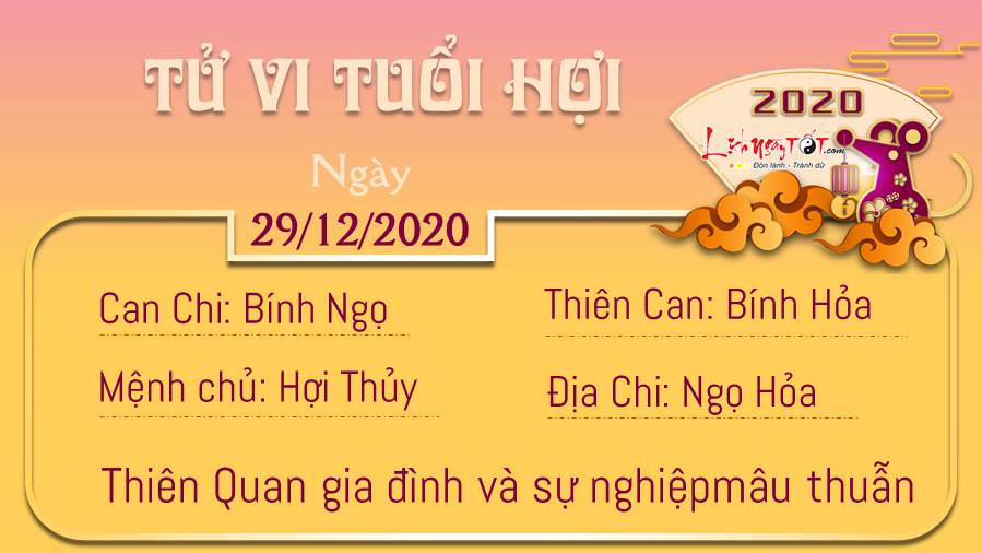 Thiên Quan dự báo hôm nay gia đình và sự nghiệp có thể có sự mâu thuẫn, nhưng đó chỉ là chút lệch pha bé nhỏ và tuổi Hợi có thể dàn xếp được. Đây là ngày mà bạn buộc phải học cách để thỏa hiệp, thay vì khăng khăng bảo vệ quan điểm của chính mình. Thủy - Hỏa tương khắc dự báo rắc rối về tiền, khi nói đến tiền bạc, tốt nhất là nên chậm rãi và thận trọng. Hãy dành thời gian để suy nghĩ khi đứng trước bất cứ vấn đề lớn nào về tiền nong. Chớ nên vội vàng, thiếu tính toán, nếu không bạn sẽ đau đầu về tiền trong tương lai đấy. Hôm nay nếu đi đâu xa, bản mệnh nên ưu tiên hướng xuất hành là hướng Hỷ thần (hướng thần may mắn): Hướng Tây Nam, hoặc hướng Tài thần (hướng thần tài): Hướng Đông.