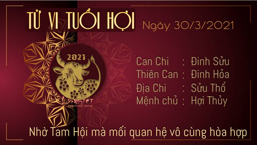 Nhờ có sức mạnh của Tam Hội mà mối quan hệ giữa bản mệnh và người nhà vô cùng hòa hợp. Dù công việc bận rộn hay căng thẳng, bạn cũng không quên dành thời gian quan tâm đến các thành viên trong gia đình, gắn kết tình cảm giữa mọi người. Chính Quan hỗ trợ để con giáp tuổi Hợi thuận lợi hơn trong công việc. Sự may mắn kết hợp với tham vọng sẽ giúp cho bạn có những bước tiến dài ngày hôm nay. Thủy - Thổ xung khắc vận trình tình cảm của người tuổi Hợi không được tốt vì xa mặt cách lòng, trong khi những cặp đôi ở gần thì đôi bên dễ nảy sinh bất đồng, cãi vã. Tranh cãi với người mình yêu, có thể bạn thắng, nhưng tình cảm thì đã nhạt phai.
