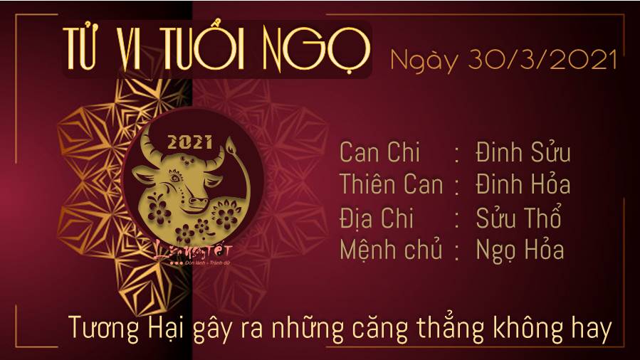 Sửu Ngọ Tương Hại gây ra những căng thẳng giữa người tuổi Ngọ và người thân của mình trong ngày hôm nay. Thế nhưng đừng quá xem nặng chuyện này bạn nhé, đôi lúc vẫn không tránh được những thời điểm khắc khẩu, tranh cãi, nhưng trên hết là sau đó hiểu và thông cảm cho nhau hơn. Tỷ Kiên nhắc nhở con giáp tuổi Ngọ nhớ rằng những người tưởng như ngọt ngào nhưng lại nanh độc, tìm cách âm thầm hại bạn suốt thời gian qua mà bạn vô tư không để ý tới. Hỏa - Thổ tương sinh hỗ trợ để bạn và một nửa của mình có thêm thời gian để gắn kết tình cảm, bạn không bao giờ quên hâm nóng cảm xúc cho hai người và đó là tín hiệu tốt.