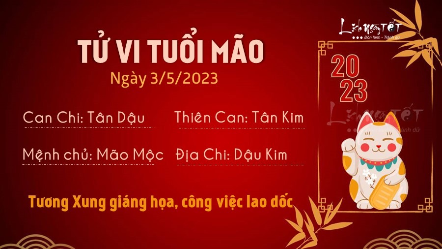 Công việc của tuổi này xuống dốc vì hôm nay Tương Xung giáng họa. Những rắc rối liên tục tìm đến khiến Mão không thể ngơi tay, đầu bù tóc rối suốt cả ngày. Dạo gần đây có vẻ như bạn hay gặp tiểu nhân trong công việc, cạnh tranh nhau từng chút một, buôn bán khá vắng khách, không nhận được sự ủng hộ từ người thân. Nhưng tiền bạc thì được cứu vớt nhờ Thiên Tài trợ vận. Vì có nhiều việc cần tới tiền nên bạn cũng rất khéo trong việc cân đối thu chi, tiết kiệm tiền. Những khoản đầu tư hiện tại có dấu hiệu tích cực đem lại nguồn lợi nhuận tốt cho Mão. Vận tình tình cảm không tốt như bạn vẫn nghĩ. Những cặp đôi đang yêu vẫn còn bất đồng, giữa 2 người có những rạn nứt ngầm. Đào hoa vượng khiến con giáp này dễ vướng vào tin đồn không hay trong chuyện tình cảm hôn nhân.