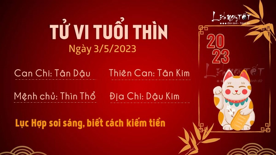 Ngày mới có Chính Ấn chiếu mệnh nên Thìn rất thông thái, nhận được sự tín nhiệm từ cấp trên. Với bạn, ở thời điểm hiện tại, hạnh phúc nhất chính là có công việc ổn định, có thời gian cho bản thân. Tuy nhiên vì quá an phận thủ thường nên con giáp này còn lười phấn đấu, muốn thành công lớn cần sự dũng cảm hơn hiện tại. Con giáp này nhờ có Lục Hợp soi sáng nên cũng biết cách kiếm tiền, lập kế hoạch chi tiêu, giúp tiền đẻ ra tiền. Mặc kệ người khác nói bạn là con giáp keo kiệt, họ đâu ở trong hoàn cảnh của bạn mà họ hiểu, đôi khi nếu không nhờ sự keo kiệt đó thì bạn đã ngập đầu trong nợ nần từ lâu rồi. Nhờ ngũ hành Thổ sinh Kim nên Thìn đạt nhiều bước tiến mới trong tình cảm. Tất cả những cố gắng của bạn dành cho người mình thích hôm nay sẽ được đền đáp. Tình yêu của bạn dành cho con cái cũng được thấu hiểu, nhất là những bạn đang vất vả học làm mẹ.