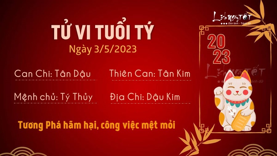 Tương Phá hãm hại khiến tuổi Tý khá mệt mỏi trong công việc. Đi xa công tác dễ gặp tai họa bất ngờ, buôn bán vắng khách, có kẻ ném đá giấu tay. Nay bạn nên hạn chế ăn nói bừa bãi, không khai trương, không đi xa để bình an vô sự. Tuy nhiên tiền bạc vẫn khá ổn định nhờ Thực Thần chiếu cố. Con giáp này có thêm thu nhập từ nghề tay trái hoặc được người khác cho đồ ăn, tặng quà. Ai có thân hình càng đầy đặn càng dễ có tiền, nhất là những bạn làm trong ngành hàng ăn uống hoặc kinh doanh tự do. Đường tình duyên có dấu hiệu tiến triển nhờ Kim Thủy tương sinh. Hãy cố gắng giữ bình tĩnh nhìn nhận mọi thứ theo chiều hướng tích cực thì mọi chuyện sẽ không quá nghiêm trọng. Tình duyên cần sự thấu hiểu của bạn nhiều hơn và hôm nay bạn đã làm được.