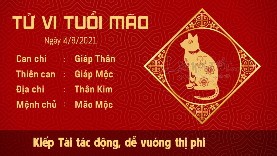 Kiếp Tài tác động, người tuổi Mão dễ vướng phải những phi vụ tranh quyền đoạt lợi giữa đồng nghiệp, bạn bè với nhau. Bạn cần giữ vững lập trường và tập trung vào nhiệm vụ của mình, chớ để bản thân lung lay vì những lời rủ rê, bàn ra tán vào của những đồng nghiệp xấu. Bạn vốn là một người mạnh mẽ, kiên định nhưng đôi khi, những quyết định của bạn quá chủ quan, nông nổi, khiến bạn phải đối diện với nhiều rắc rối. Vì vậy, bạn cần học cách bàn bạc, trao đổi với mọi người xung quanh nhiều hơn, đừng tự cô lập bản thân với tập thể. Kim khắc Mộc cho thấy mối quan hệ giữa con giáp này và người nhà không quá yên bình.