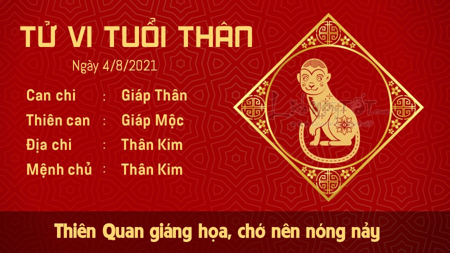 Thiên Quan giáng họa, để tránh vướng phải những vụ tranh chấp, thị phi, người tuổi Thân cần phải kiềm chế bản tính nóng nảy, dễ bị kích động của mình. Bạn không nên để những việc này gây ảnh hưởng đến sự nghiệp của mình hoặc các mối quan hệ xã giao. Nếu giữa bạn và lãnh đạo có bất cứ bất đồng gì thì bạn cũng không nên có cách cư xử quá gay gắt, bởi dù có thắng hay thua trong cuộc tranh luận thì chưa chắc bạn đã nhận được lợi ích. Kim khí vượng, bản mệnh cần quan tâm hơn đến sức khỏe, đặc biệt là các bệnh liên quan đến xương cốt. Người lớn tuổi chú ý không làm việc quá sức, người còn trẻ cũng không nên làm việc quá sức, bỏ qua cảnh báo của cơ thể.