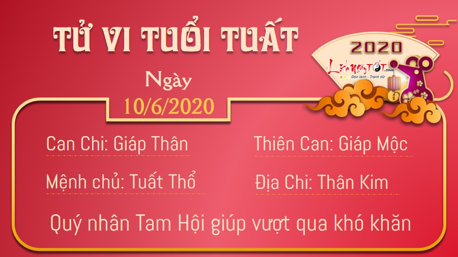 Mọi dự định của con giáp này trong ngày hôm nay có thể hanh thông cũng một phần nhờ sự trợ giúp của quý nhân Tam Hội. Dù có gặp khó khăn vướng mắc trong lúc này thì bản mệnh cũng dễ dàng vượt qua. Quý nhân có thể ở ngay bên cạnh bạn, là người thân, bạn bè, đồng nghiệp, cấp trên hay đối tác của bạn. Thiên Tài độ mệnh, người tuổi Tuất có thể đón nhận những tin vui tiền bạc bất ngờ. Cơ hội phát tài nhanh chóng này chẳng mấy ai có được đâu, hãy biết tận dụng lợi thế của bản thân, nếu không bạn sẽ phải hối tiếc về sau đó. Chuyện tình cảm của bạn có nhiều tín hiệu khởi sắc trong ngày ngũ hành Thổ Kim tương sinh.