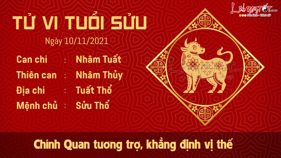 Chính Quan tương trợ, tuổi Sửu khẳng định được vị trí không thể thay thế của mình trong tập thể. Bạn đưa ra những giải pháp thích hợp cho nhiều tình huống khó khăn và không bao giờ e ngại khó khăn, gian khổ. Bản mệnh có thể trở thành tấm gương sáng cho đồng nghiệp và cấp dưới noi theo. Điều quan trọng bây giờ là bạn cần tìm được định hướng chính xác cho sự nghiệp của mình để có thể phát triển mạnh mẽ hơn nữa. Đừng vội hài lòng vì những thành công ở hiện tại. Thổ vượng cho thấy trong ngày hôm nay, bản mệnh dễ mắc các bệnh về đường tiêu hóa. Vì vậy, bạn cần quan tâm hơn đến chế độ ăn uống của mình, đồng thời sinh hoạt khoa học, giờ nào việc nấy để cơ thể luôn khỏe mạnh.