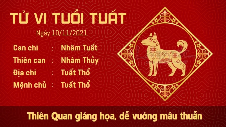 Thiên Quan giáng họa, tuổi Tuất dễ phải va chạm với người có quyền cao chức trọng trong ngày hôm nay. Bản mệnh nên ý thức được vị thế của mình để kiềm chế tính nóng nảy và cư xử cho đúng mực, đừng nên "cố đấm ăn xôi" mà hỏng mọi việc. Khi gặp phải mâu thuẫn với bạn bè, cấp trên, bạn không nên cố tình nói những lời cay nghiệt gây tổn thương cho đối phương và tổn hại các mối quan hệ của mình. Nếu có thể, hãy "chín bỏ làm mười" để hóa giải những bất đồng không đáng có. Thổ vượng cũng khuyên bạn chớ nên giữ mãi những suy nghĩ cố hữu của mình trên bất kì lĩnh vực nào. Hãy thay đổi góc nhìn sự vật, sự việc, bạn sẽ nhìn nhận ra nhiều điều hữu ích và có hướng đi mới hơn cho mình.