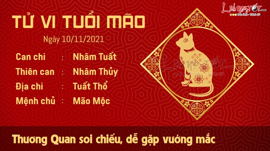 Thương Quan đem lại nhiều tác động tiêu cực, khiến người tuổi Mão dễ vướng vào mâu thuẫn với cấp trên. Bạn nên tìm cách diễn đạt vấn đề hợp lý và uyển chuyển để vừa không làm mất lòng cấp trên mà vẫn vừa đạt được mục tiêu của mình. Một vài người gặp phải khó khăn, trở ngại chớ nghĩ đến việc bỏ cuộc giữa chừng, vì như vậy thì công lao của bạn suốt thời gian qua sẽ đổ sông đổ bể. Tốt nhất nên bình tĩnh để nhìn nhận, đánh giá lại vấn đề, bạn sẽ nhận ra mình đang sai lầm ở đâu. Hôm nay trực Bế là ngày xấu mọi việc trừ đắp đê, lấp hố, rãnh. Vì vậy, tốt nhất bản mệnh không nên thực hiện những việc quan trọng trong ngày hôm nay. Hãy dời sang ngày khác nếu muốn gặp nhiều may mắn hơn.