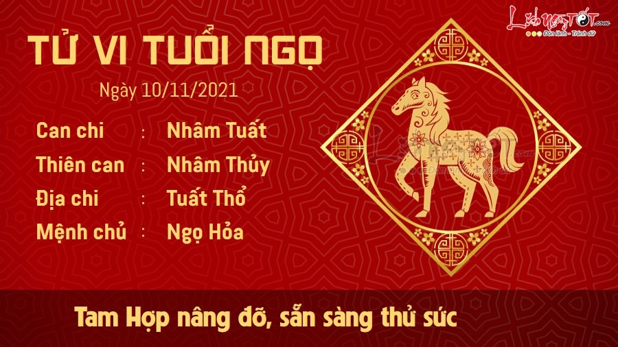 Tam Hợp nâng đỡ, người tuổi Ngọ cảm thấy hăng hái sẵn sàng thử sức mình trong những lĩnh vực mới mẻ. Bạn cho rằng càng dám xông pha bao nhiêu, mình sẽ càng trở nên tài giỏi, bản lĩnh bấy nhiêu. Tuy nhiên, con giáp này cần nhắc nhở mình kiên nhẫn hơn trong công việc, đừng hăng hái bước đầu rồi về sau lại thành ra bỏ bê, chán nản. Nếu bạn bỏ dở công việc giữa chừng, người khác sẽ phải tốn công sức để khắc phục, hoàn thành nốt giúp bạn đấy. Hỏa sinh Thổ, bản mệnh có thể nhận được lời bày tỏ của người khác phái trong ngày hôm nay. Đây vốn là một việc rất đáng mừng, vì vậy nếu cũng có thiện cảm với nhau, bạn hãy thử cho đôi bên cơ hội để tìm hiểu sâu hơn về nhau xem sao.