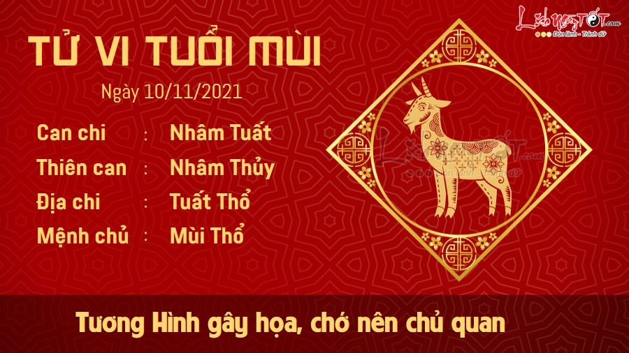 Tương Hình giáng họa, người tuổi Mùi không ý thức đến tình hình thực tế nên luôn tự coi mình là nhất, không muốn nghe theo lời khuyên nhủ của người khác. Tính chủ quan có thể đẩy bạn vào những rắc rối không đáng có. Dù đã bao nhiêu tuổi đi chăng nữa, bản mệnh cũng không thể biết chắc được tất cả mọi điều. Vì vậy, hãy tự nhắc nhở mình cởi mở, lắng nghe ý kiến của người khác xem sao. Có thể bạn sẽ có cách nhìn nhận khác về vấn đề đấy. Nếu có việc cần thiết phải đi xa trong ngày hôm nay, bạn có thể đi về hướng Nam để gặp Hỷ thần hoặc hướng Tây để gặp Tài thần, đồng thời xuất hành vào giờ hoàng đạo để có thể được may mắn, thuận lợi hơn.