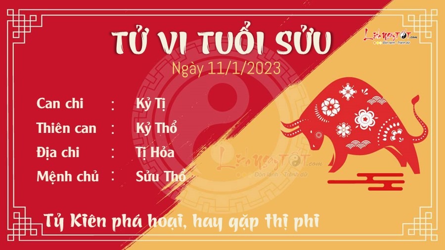 Hôm nay tuổi Sửu bị Tỷ Kiên phá hoại nên công việc không được như ý muốn, làm ăn hay gặp thị phi. Tuổi này hay bị người ta cạnh tranh, sân si khi đi làm, càng về cuối năm càng vướng vào những chuyện không đâu, nên cẩn thận chút. Đường tài lộc phát triển nhờ Tam Hợp nâng đỡ. Thời gian này hãy cứ mặc kệ miệng thiên hạ, lộc ai người đó hưởng, tiền bạn làm ra, của cải bạn mua được không nên hổ thẹn. Nhiều người nên thử kinh doanh buôn bán để xem vận may của mình lớn tới đâu. Đường tình cảm tốt lên nhờ cục diện Hỏa sinh Thổ. Nếu còn cô đơn thì hôm nay cực thích hợp để bạn tỏ tình, còn chờ gì nữa mà không chủ động ngỏ lời với người ấy. Người có gia đình rất có trách nhiệm với họ hàng hai bên, chuyện gì bạn cũng lo được.