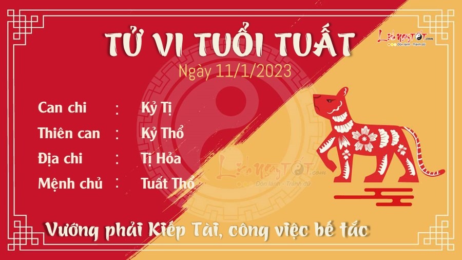 Công việc vướng vào Kiếp Tài khiến Tuất bế tắc không lối thoát. Bạn luôn cẩn trọng, tỉ mỉ trong công việc nhưng hay kẻ xấu nắm thóp, bắt được lỗi của mình. Bạn cũng đừng quá dễ tin người, nhiều người nhìn tốt vậy thôi nhưng thực ra rất ghét bạn, thấy bạn thành công là nóng mặt. Đường tiền tài của bản mệnh đi xuống, năm hết Tết gần đến nên cẩn thận trộm cắp, cướp giật, bị “chặt chém” khi đi mua hàng. Bản mệnh dễ mất tiền oan vì những chuyện không đâu, đi nhập hàng nên cẩn thận gian thương lừa lọc. Cục diện Hỏa Thổ tương sinh đem lại may mắn cho bản mệnh. Đôi khi ông trời cố ý làm cho bạn phát hiện ra điều gì đó, không phải để bạn buồn. Mà là cảm thấy bạn bị lừa dối quá đáng thương, cho nên ông trời đã ngầm ám chỉ cho bạn nên đừng hối tiếc những người đã ra khỏi cuộc đời bạn.