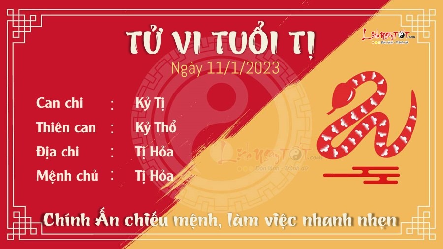 Chính Ấn chiếu mệnh cho biết tuổi Tị vô cùng thông minh và sáng suốt trong công việc. Bạn làm việc nhanh nhẹn, không để công việc bị tồn đọng, không muốn bị cấp trên hối thúc. Nhiều người muốn làm ăn to nhưng chưa có gan nên chưa dám phấn đấu và làm ăn lớn, vì thế nên cuối năm chưa có gì nổi bật. Đường tiền bạc hơi éo le nhưng không đến nỗi tệ. Bạn phải chi tiêu quá nhiều thứ trong sinh hoạt hàng ngày. Đừng phung phí mà thay vào đó hãy học cách tiết kiệm, thời gian tới sẽ có lúc bạn phải dùng đến rất nhiều tiền đó. Chuyện tình cảm không có gì nổi bật do hai hành Hỏa tương hòa. Vợ chồng thời gian này nên nhường nhịn lẫn nhau để con cái lấy cha mẹ làm gương. Bạn nên đi ngủ sớm để cải thiện sức khỏe và tâm trạng kẻo cáu gắt với người xung quanh.