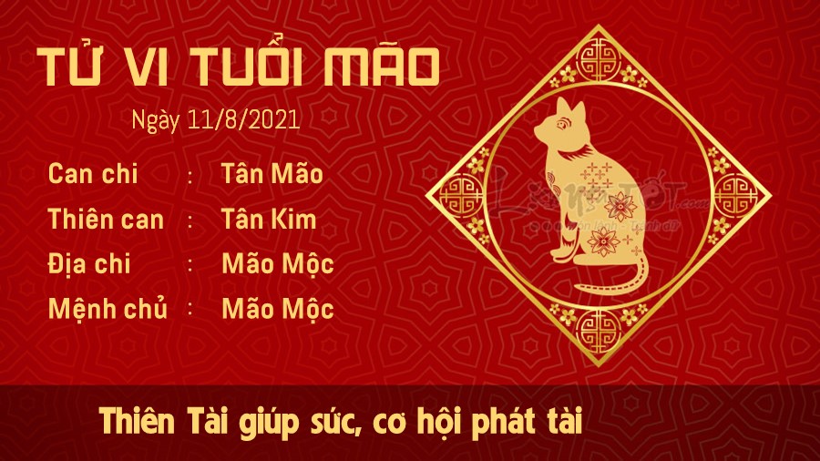 Thiên Tài giúp sức, người tuổi Mão có cơ hội phát tài trong ngày hôm nay, đặc biệt là với những ai làm việc tự do. Bạn chắc chắn sẽ nhận được phần thưởng xứng đáng nếu đã chăm chỉ làm thêm trong suốt thời gian qua. Bản mệnh là người thông minh, nhạy bén và cũng rất phóng khoáng với mọi người, tuy nhiên, tật xấu của bạn là hay ba hoa, khoác lác. Đừng quá kiêu ngạo như vậy, hãy khiêm tốn hơn để nhận ra và học hỏi những điều hay từ mọi người. Nếu có việc cần phải đi xa trong ngày hôm nay, con giáp này nên xuất phát vào giờ hoàng đạo và lựa chọn những hướng đi tốt để công việc thêm phần thuận lợi. Hôm nay Hỷ thần và Tài thần xuất hiện ở hướng Đông Nam.