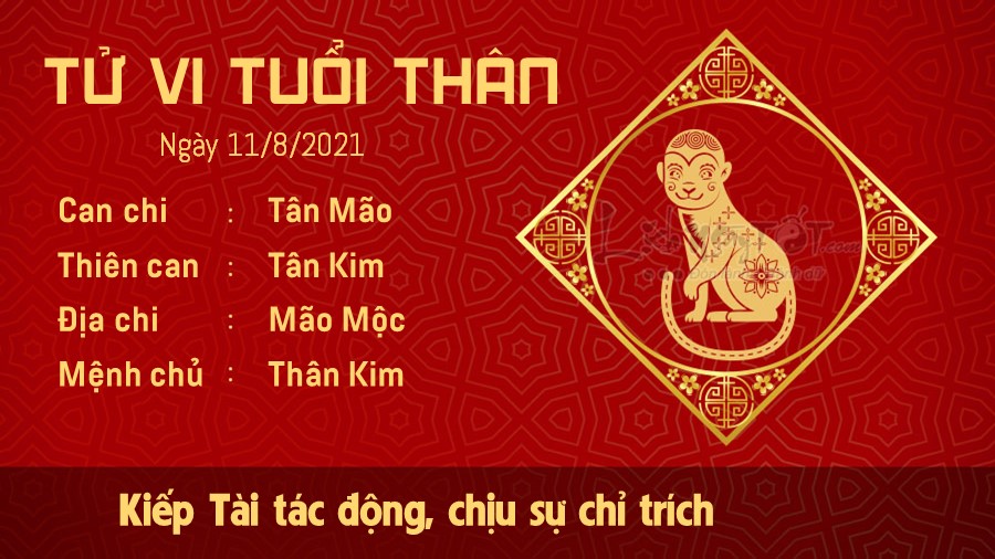 Do chịu tác động của Kiếp Tài, người tuổi Thân sẽ gặp phải nhiều điều không như mong muốn trong sự nghiệp. Thậm chí, nếu đang ở vị trí lãnh đạo, bản mệnh sẽ phải chịu sự chỉ trích và thiếu tin tưởng của cấp dưới. Nếu là người làm công ăn lương, bạn cần tránh mâu thuẫn với đồng nghiệp và bạn bè xung quanh. Hãy giữ bình tĩnh để giải quyết vấn đề một cách lý trí nhất có thể. Mọi việc sẽ càng trở nên bế tắc hơn nếu bạn nóng giận. Kim khắc Mộc, bạn và nửa kia có thể xảy ra tranh cãi trong ngày hôm nay. Vợ chồng có một vài quan điểm không phù hợp với nhau là chuyện bình thường, bạn chớ nên vì điều ấy mà thất vọng hoặc nói ra những lời gây tổn thương đối phương.