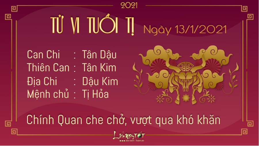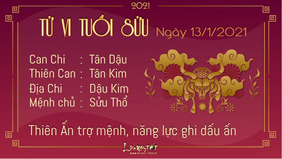 Tuổi Sửu gặp không ít thuận lợi dưới sự trợ giúp cục diện Dậu Sửu Bán Hợp trong ngày này. Công việc trở nên hanh thông suôn sẻ hơn nên bạn nhanh chóng có được thành quả đúng như mong muốn của mình. Lại có Thiên Ấn trợ mệnh, con giáp này tự tin vào năng lực của bản thân, thể hiện được những khía cạnh đặc biệt của mình, ghi dấu ấn đặc biệt với đồng nghiệp và cấp trên. Chắc hẳn bước đường tiến đến thành công của bạn sẽ còn rộng mở hơn ở phía trước. Người độc thân có thể gặp được nhân duyên của cuộc đời mình trong ngày Thổ sinh Kim. Đừng vội từ chối những lời hẹn, hãy cho bản thân thêm cơ hội đi nhé!