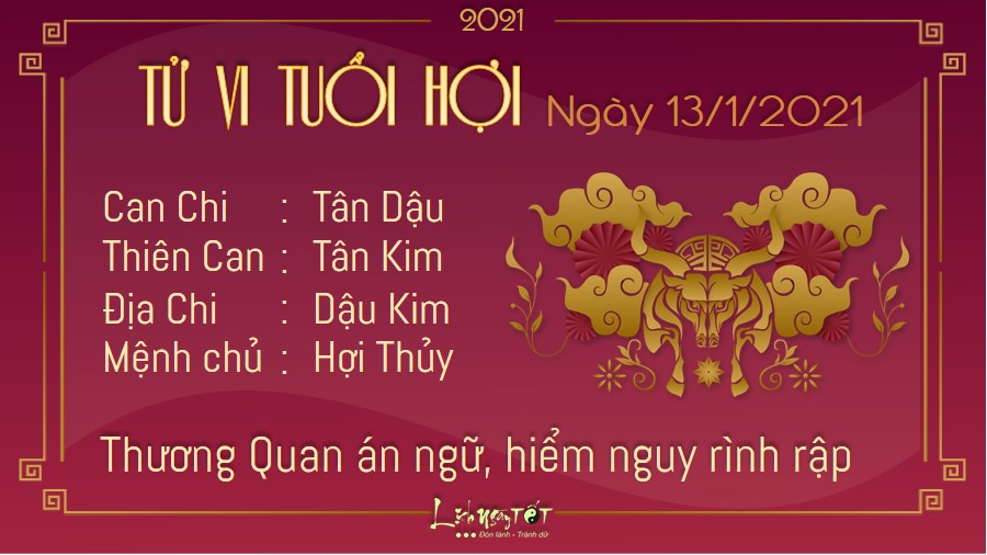 Thương Quan xuất hiện sẽ ngáng trở vận trình của người tuổi Hợi trong ngày này. Có thể chỉ vì một sơ suất nhỏ mà mọi công sức của bạn sẽ bị đổ sông đổ biển lúc nào chẳng hay. Vì vậy, trong mọi hành động quyết định, bản mệnh cần hết sức thận trọng, suy xét thật kỹ càng chứ đừng nóng vội hấp tấp kẻo hỏng việc. Nhất là trong các vấn đề liên quan đến tiền bạc, sự liều lĩnh của bạn có thể là khởi đầu cho những thất bại nối tiếp về sau. Kim Thủy tương sinh, mối quan hệ giữa các thành viên trong gia đình bạn trở nên hòa hợp hơn.